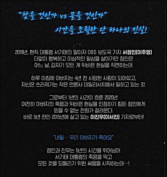 2019년 의문의 기지국 화재 사고 이후 서정인이 알던 세상이 송두리째 무너지고 현직 대통령이었던 아버지가 대선 후보 시절 선거 유세중 총격 사건으로 사망한 상황에 놓이고 1년 뒤 지하 통신구 화재로 2015년 이진우와 전화로 연결됨 그리고 5년 차의 시간과 이들은 대화가 안됨. 이에서로 화난 두 사람이 만나기로 한 장소에 만났지만 분위기는 딴판임. 그리고 수화기 너머 살아있는 서기태 목소리를 들은 서정인은 충격에 휩싸이고 서기태의 생사에 따라 2015년과 2020년이 극병하게 대비됨으로써 시청자에게 타임스의 강렬한 인상을 남김
